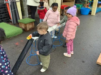 We love spending time in our garden playing on our climbing frames and in our big sand and water trays. We play outside whatever the weather, there is no such thing as bad weather, just the wrong clothes.